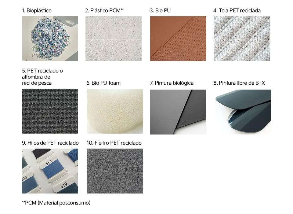 Se trata de 10 soluciones materiales como el Bio PU, el tejido PET reciclado y la pintura sin BTX que se aplicarán a los nuevos modelos Kia, lo que contribuirá a reducir el impacto en el medioambiente.